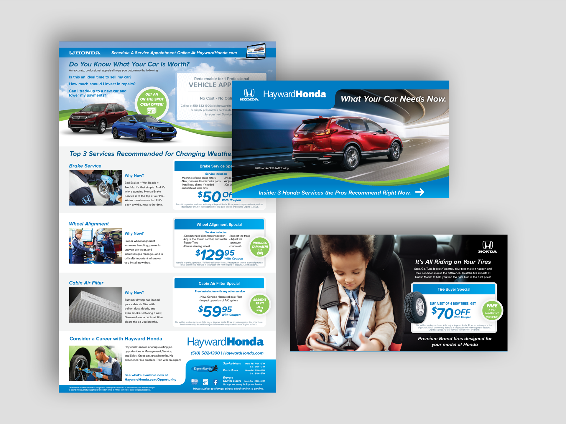 Direct mail quarterly service newsletter for Hayward Honda. Tri-fold mailer. Art direction and layout.