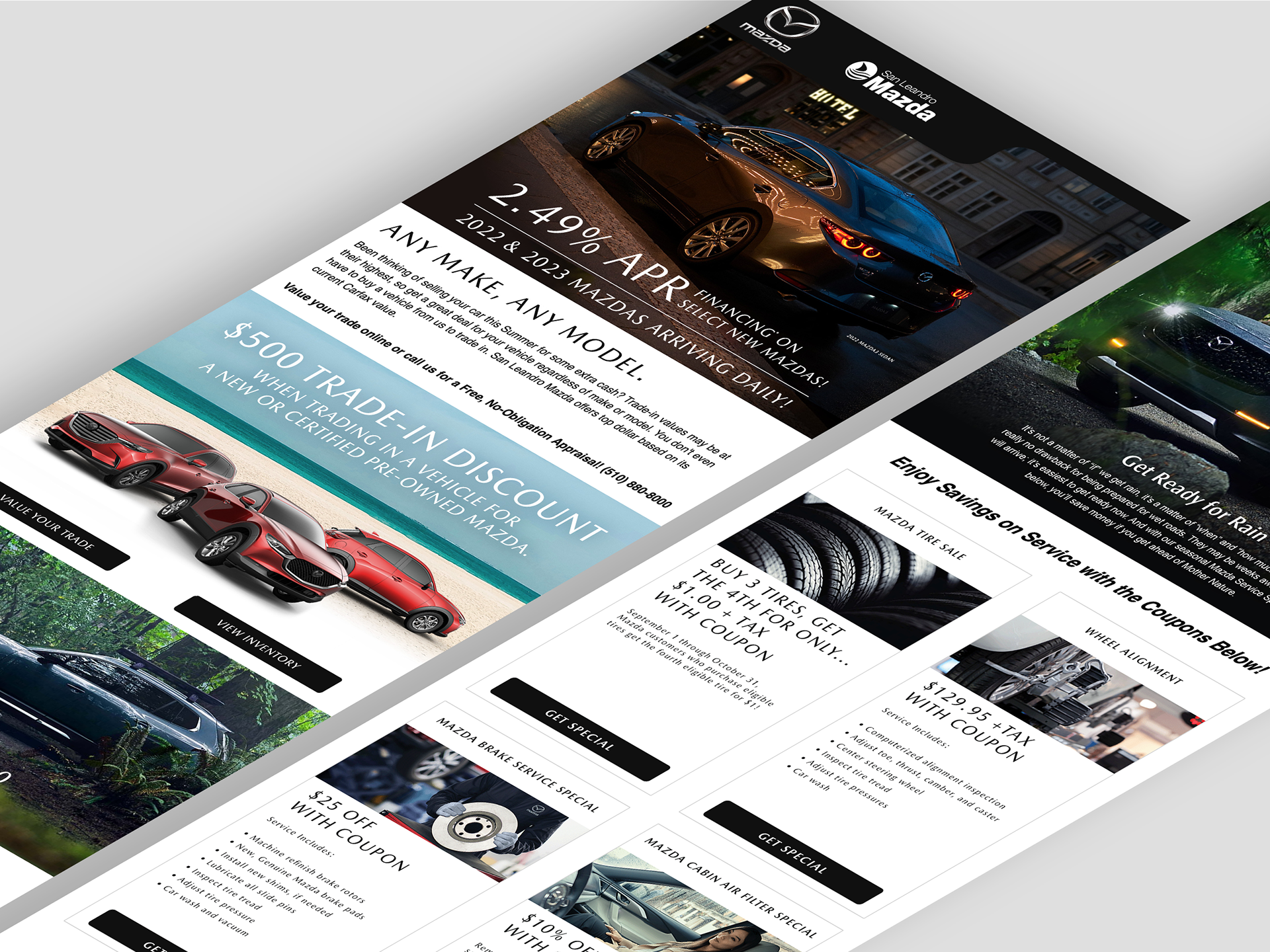 Monthly dealership sales and service emails. Responsible for designing and coding responsive email templates to be used across family of three Mazda dealerships.